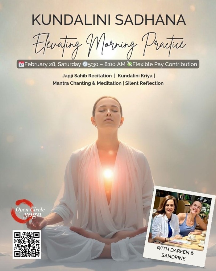 Kundalini Sadhana is a sacred early morning practice that awakens the body, stills the mind, and reconnects you with your inner light. Guided by Dareen & Sandrine, this shared experience invites clarity, vitality, and spiritual presence through movement, mantra, and meditation.